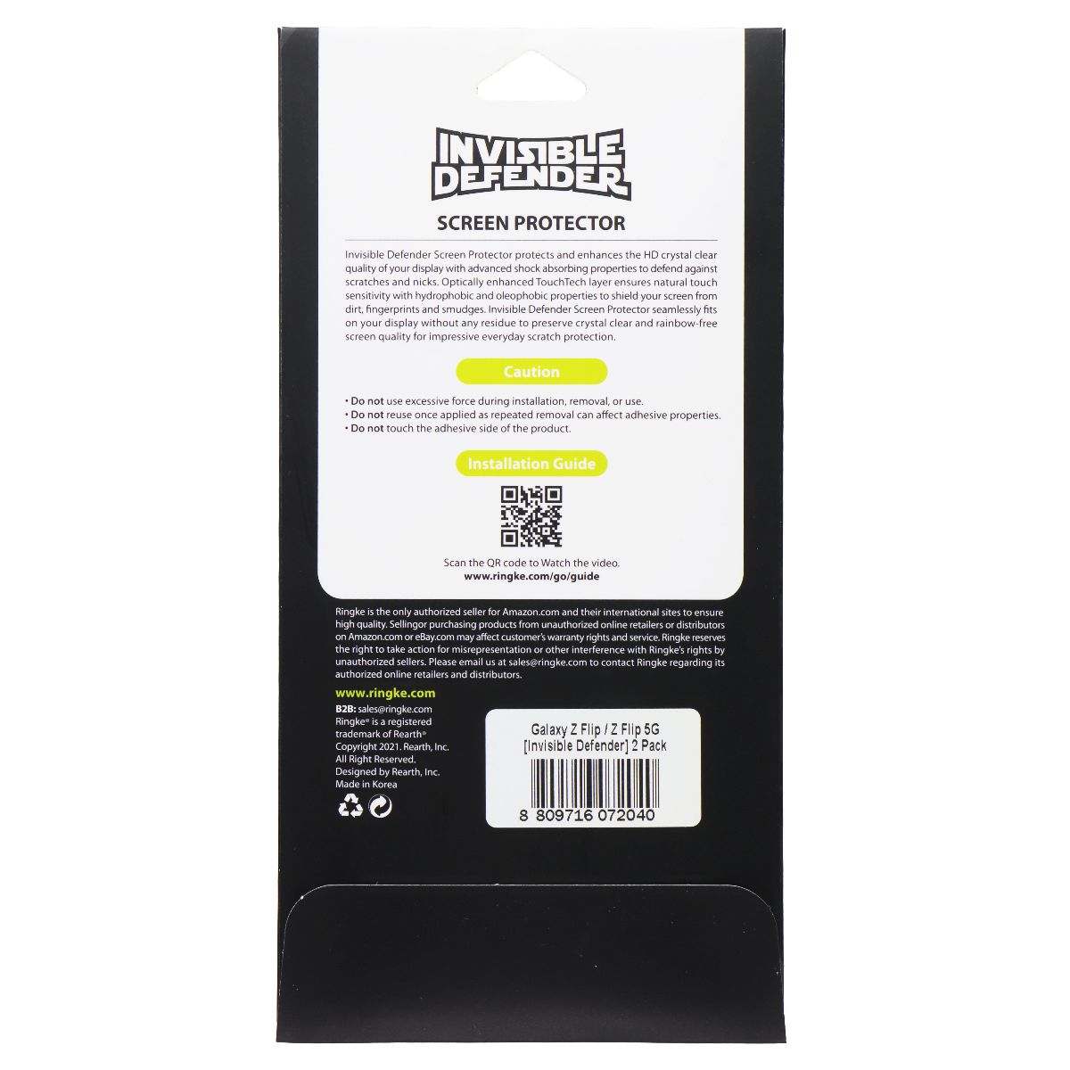 The Ringke Invisible Defender Screen Protector for Samsung Galaxy Z Flip/Z Flip 5G Smartphones. (2 Pack)